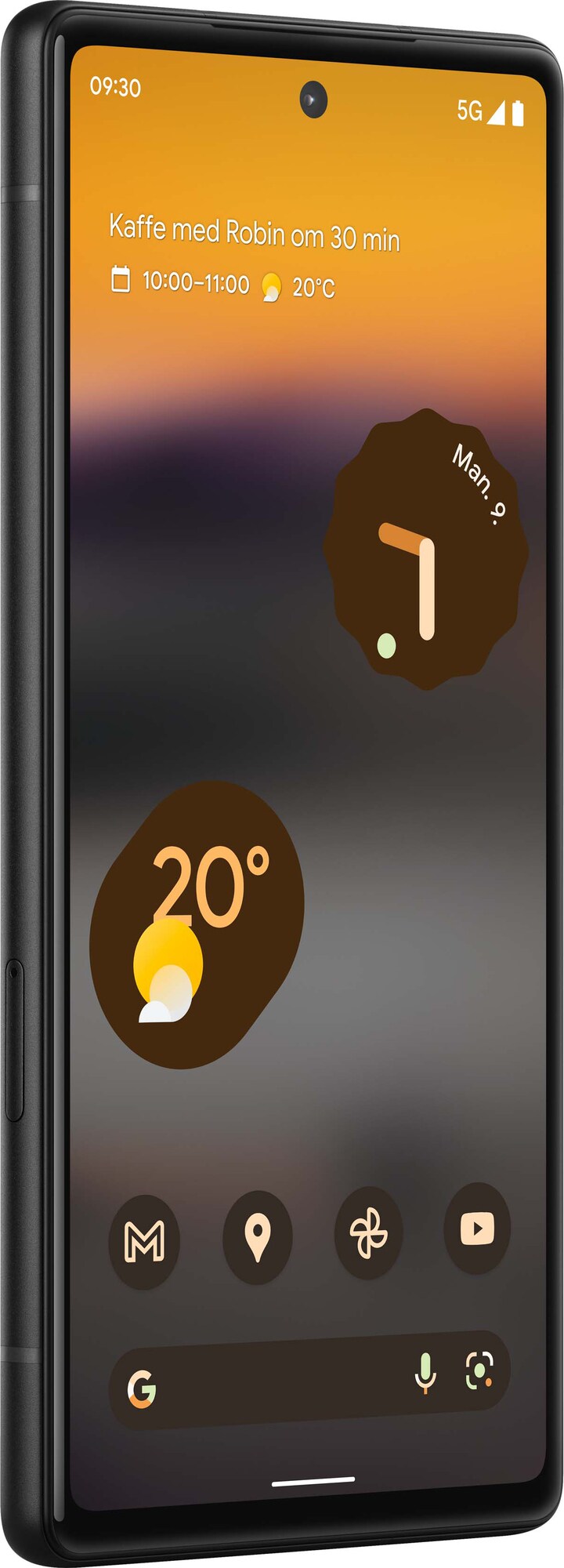 Pixel 6a kommer i den stilrena färgen ”Charcoal”, som ger ett sofistikerat och minimalistiskt intryck. Telefonen har en kompakt formfaktor med en 6,1-tums skärm, vilket gör den lätt att hantera med en hand. Den matta finishen på baksidan ger ett elegant utseende samtidigt som den förhindrar fingeravtryck och ger ett bättre grepp.